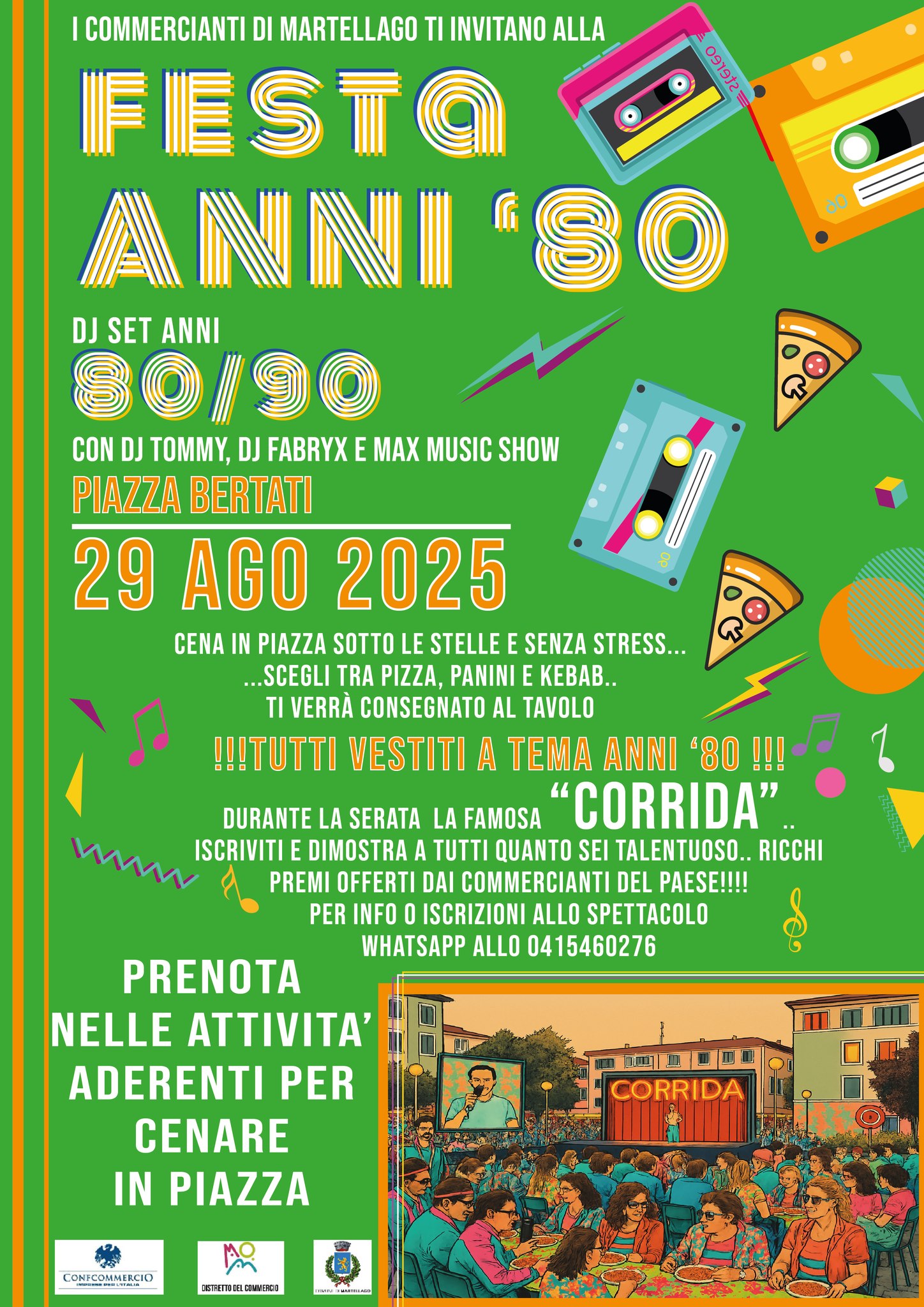 Al dj set si alterneranno i suoni e le atmosfere degli anni ’80 con DJ Tommy, DJ Fabryx e Max Music Show, pronti a far ballare tutti con i grandi successi che hanno segnato un’epoca. E tutti voi siete invitati a vestirvi come ci si vestiva ormai quarant’anni fa. Ma non solo: il programma della serata prevede anche la celebre “Corrida”, lo show amatoriale in cui chiunque potrà esibirsi e mostrare il proprio talento davanti al pubblico. Canto, ballo, imitazioni, sketch e qualsiasi altra abilità avranno spazio sul palco. In palio, premi offerti dai commercianti di Martellago. Per partecipare è necessario iscriversi al numero 041 5460276.